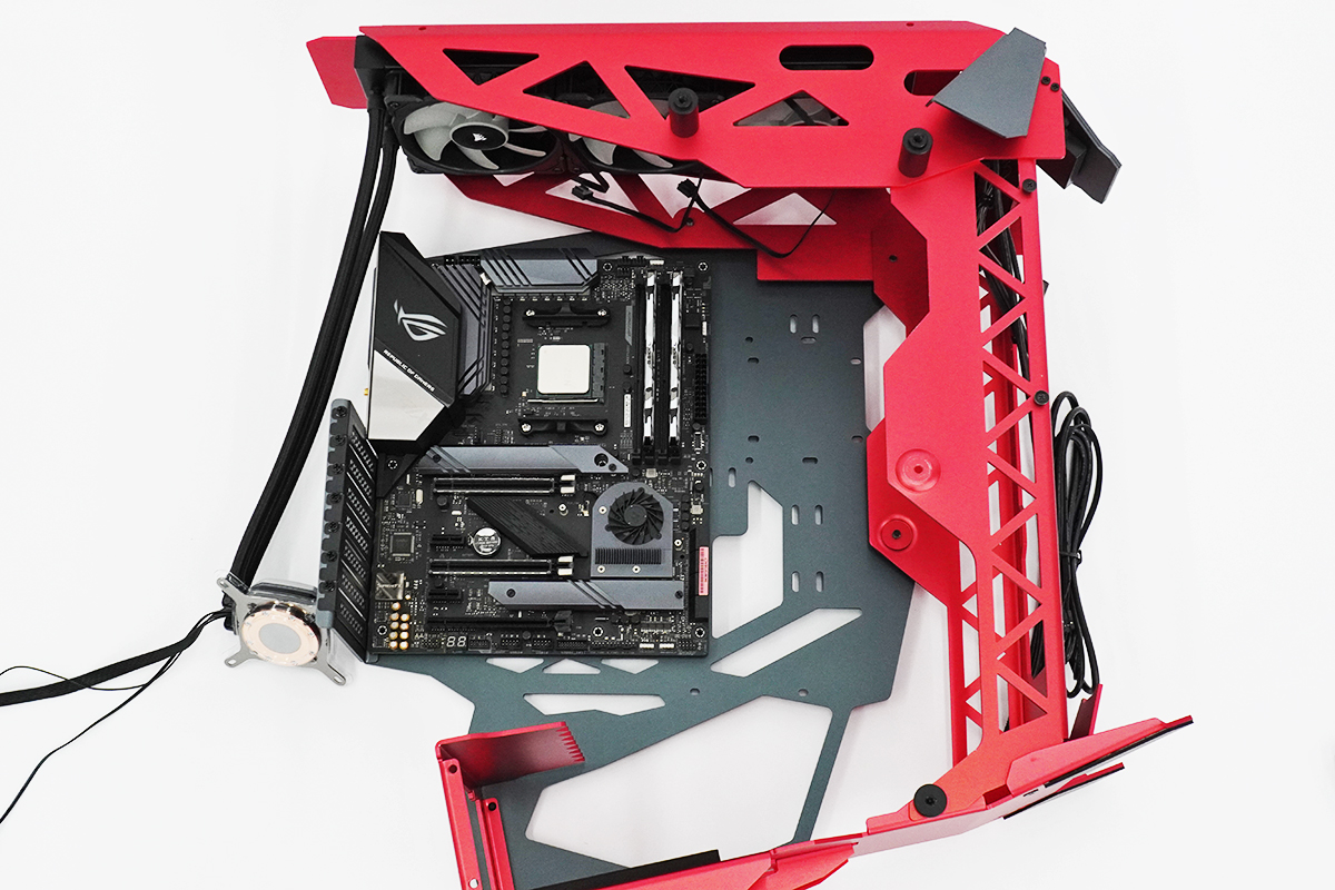 PCケースに、マザーボードと水冷クーラーがくっついてそれっぽくなってきた。