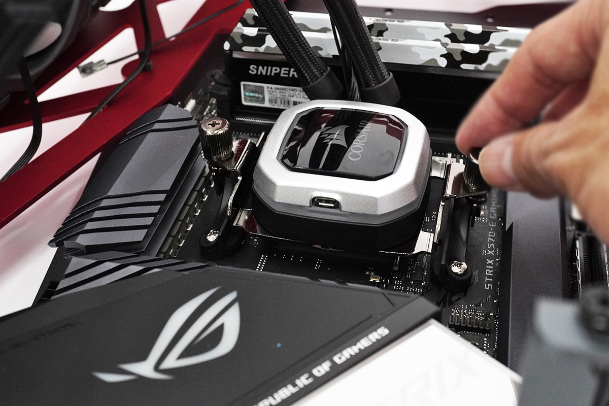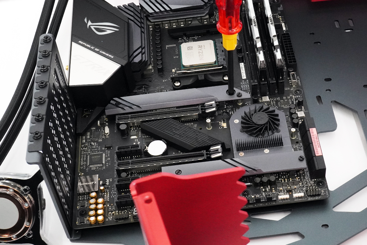 「ASUS ROG STRIX X570-E GAMING」は、マザーボードにある冷却ユニットカバーをいったん外しておかないとネジ止めできない部分が一箇所だけあるので注意。