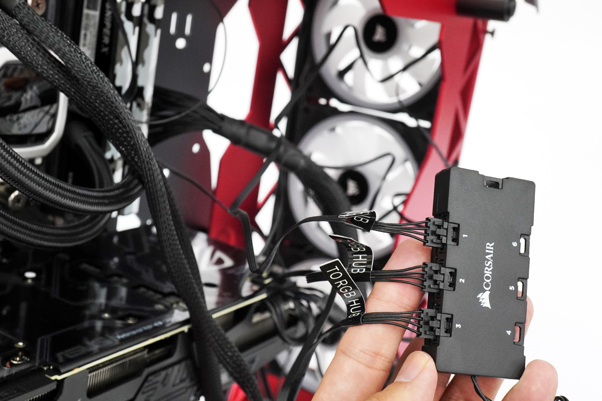 取り付けた3コのファンのRGB用ケーブルを「RGB LEDファンハブ」に接続。