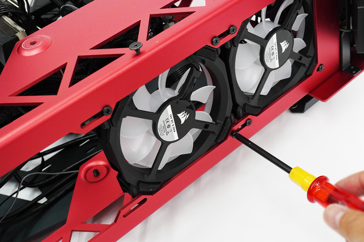 ANTEC製「Torque」PCケースの前側のスペースにネジ4つでそれぞれ3基のファンを固定。