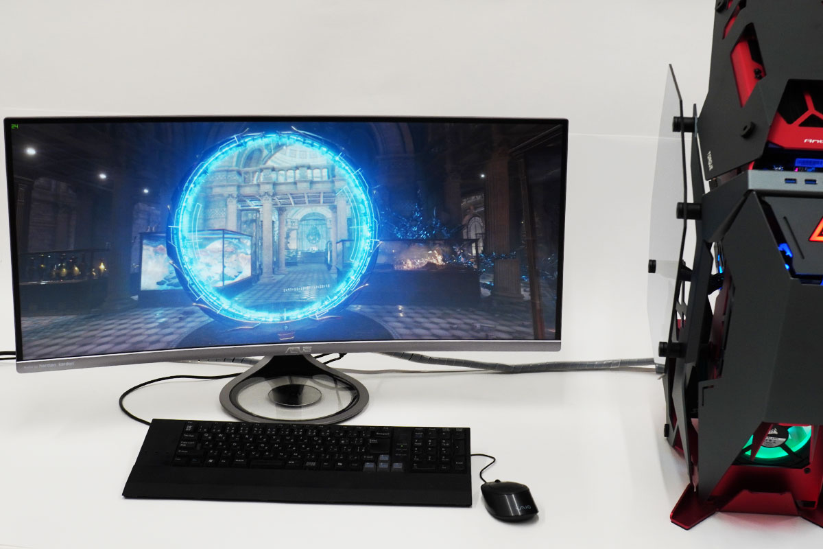全然余裕だったので、4K解像度というか手持ちのディスプレイ(ASUS ディスプレイ 湾曲ウルトラワイド34型モニターMX34VQ)にあわせた解像度でもテスト。