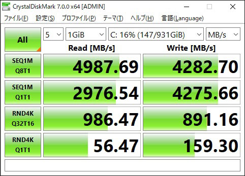 最大転送速度シーケンシャルリード4950MB/s、シーケンシャルライト4250MB/sという数値そのまんま出てビックリ。