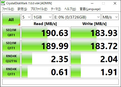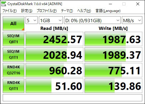 こっちも公称値の最大転送速度シーケンシャルリード2400MB/s、シーケンシャルライト1950MB/sという数値そのまんま。