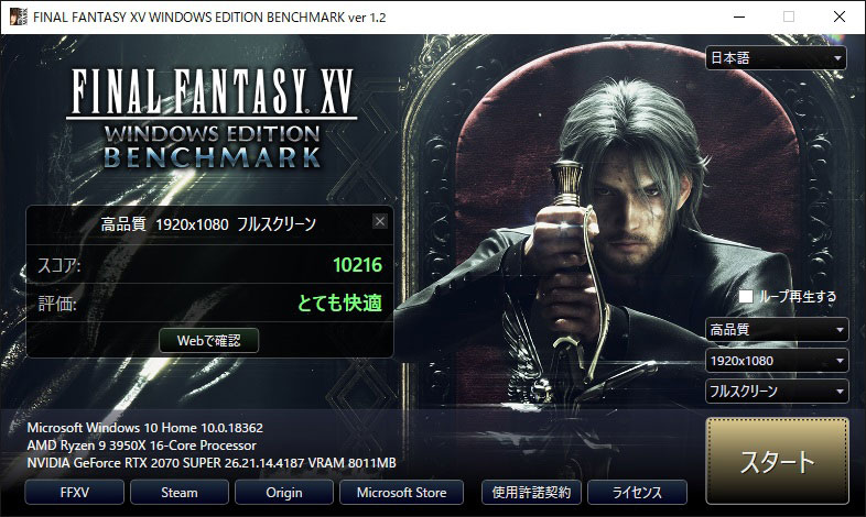 「高品質、1920x1080、フルスクリーン」でのスコアは、「10216」で「とても快適」。