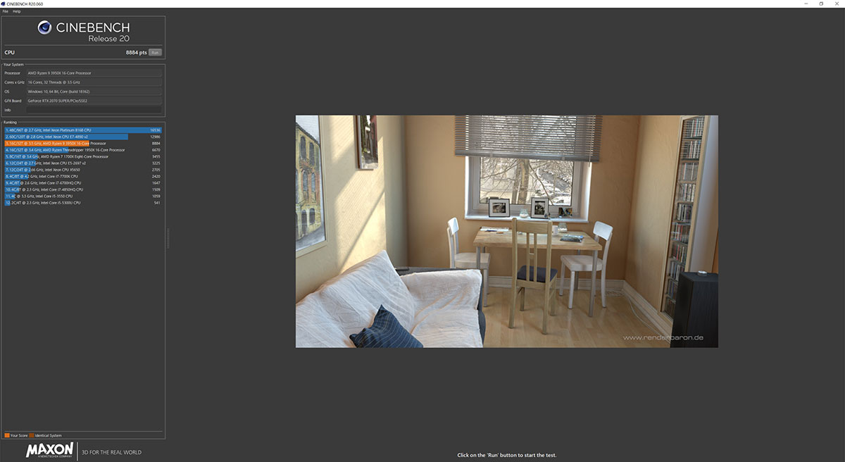 お約束のプロセッサーの3DCGレンダリング性能を測るベンチマークテスト「CINEBENCH R20」を走らせてみた。
