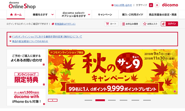 ドコモオンラインショップ、9月1日~11月30日の期間限定で「オンラインショップ限定特典」と「秋のサン9キャンペーン」を開催。