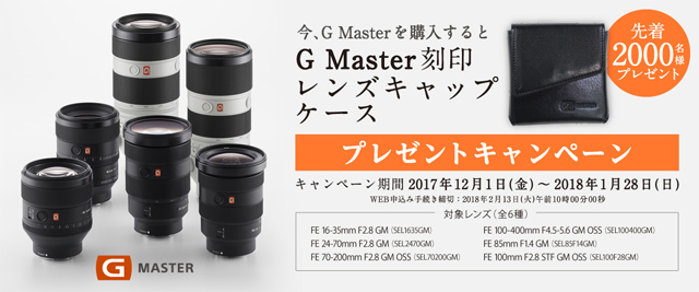 デジタル一眼カメラα EマウントシリーズのG Masterレンズを購入すると、G Master刻印レンズキャップケースが先着2,000名にもらえる「G Master刻印レンズキャップケースプレゼントキャンペーン」を2017年12月1日(金)から2017年1月28日(日)までの期間限定で開催。