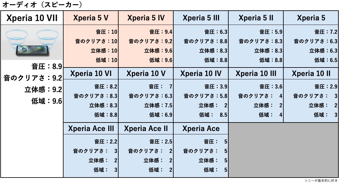 数値を比較すると、Xperia 5 VやXperia 5 IVには若干劣るものの、それ以外のモデルよりも優れたスピーカー性能をしていることを示している。