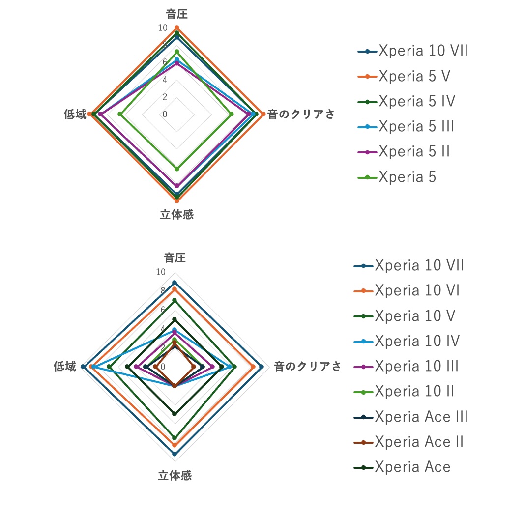 Xperia 10 VIIと5シリーズ・10シリーズ・Aceシリーズのオーディオ性能レーダーチャートをそれぞれ重ねてみると、上のグラフのようになる。