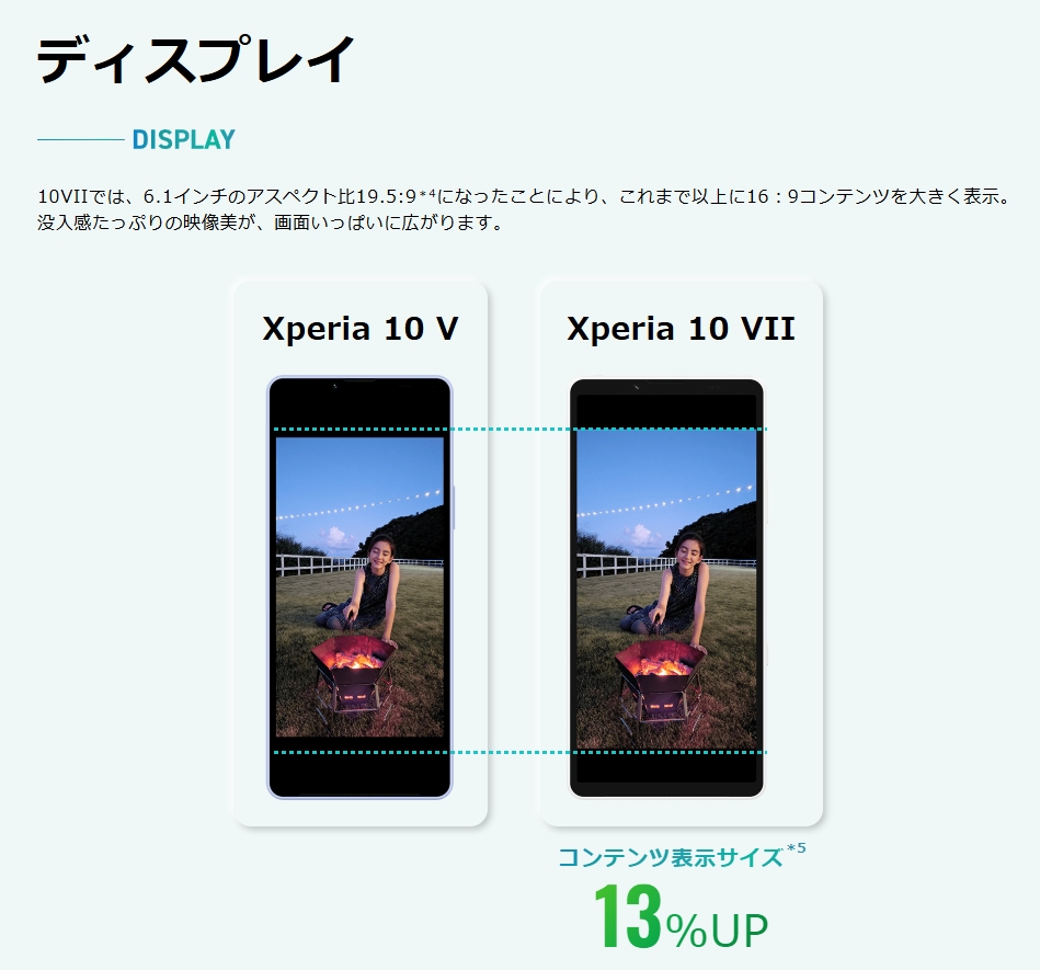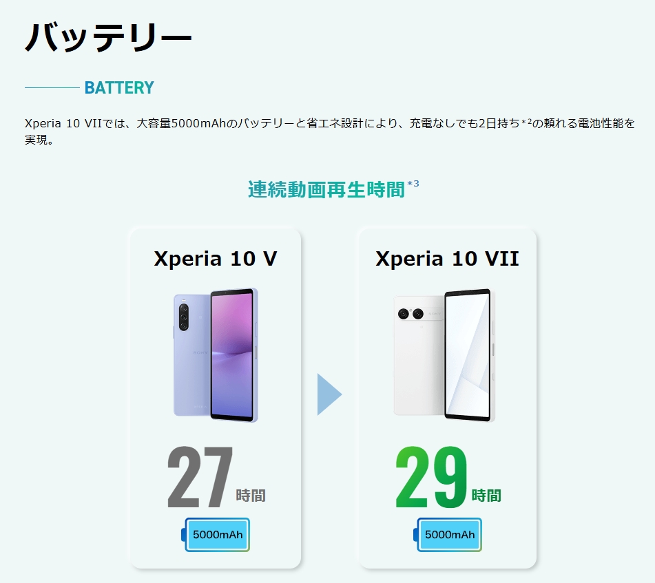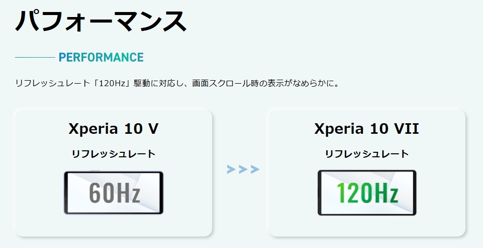 ソニー公式サイトでは、歴代XperiaからXperia 10 VIIに乗り換えた場合、どれくらい性能が上がるのか?を簡単に比較できる特設サイトも開設されている。