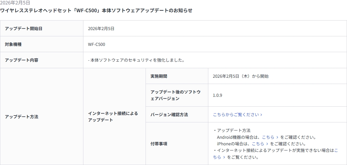 ●ワイヤレスヘッドセット「WH-CH520」、「WF-C700N」、「WF-C510」、「WF-C500」本体ソフトウェアアップデート