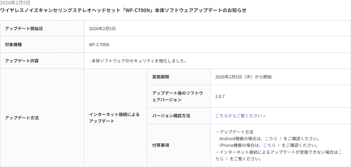 エントリー向けソニーヘッドセット4製品(WH-CH520、WF-C700N、WF-C510、WF-C500)に、本体ソフトウェアアップデート配信開始。本体ソフトウェアのセキュリティを強化。