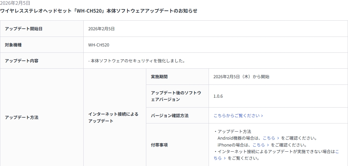 ソニーのワイヤレスステレオヘッドセットのオーバーヘッド、完全ワイヤレスそれぞれで展開されているエントリーモデル「WH-CH520」、「」、「」、「」に、本体ソフトウェアアップデートが配信開始。