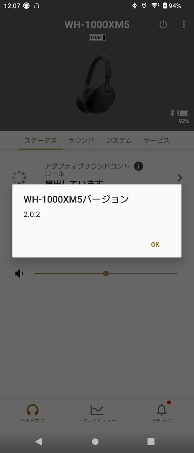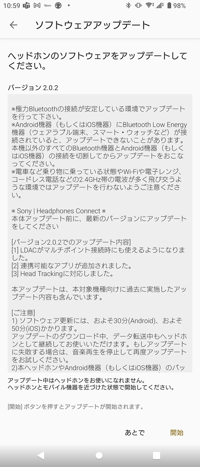 すると、WH-1000XM5」はバージョン 2.0.2WF-C700N」はバージョン 2.0.0のソフトウェア更新内容が表示されるのでOKをタップする。
