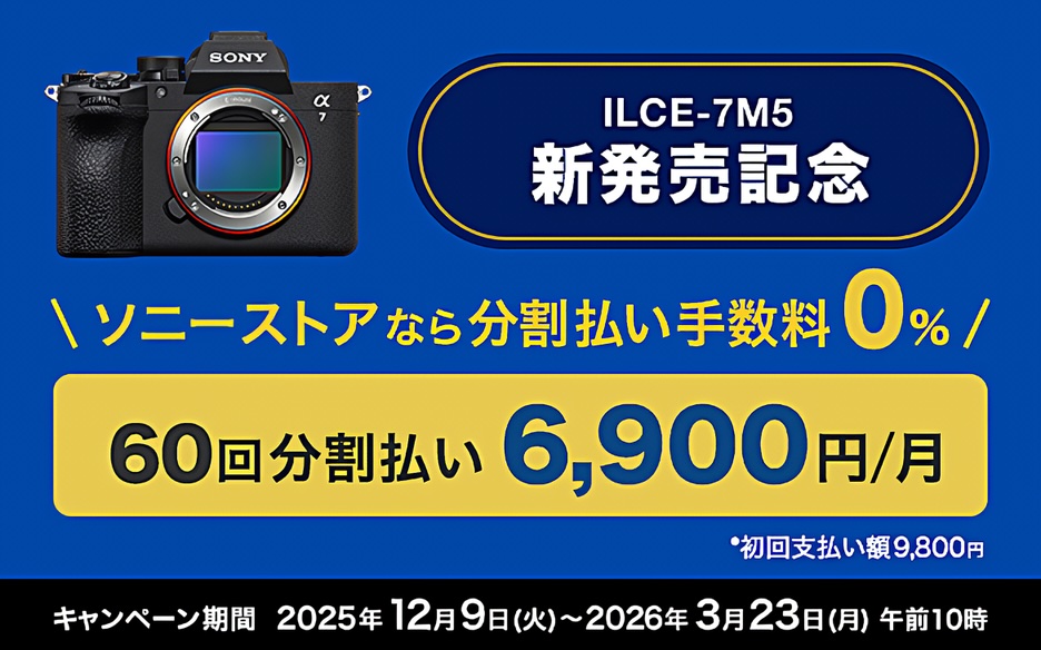 ソニーストアでは、デジタル一眼カメラα7 V「ILCE-7M5」の発売を記念して「分割払い60回まで金利手数料0%キャンペーン」を開始。