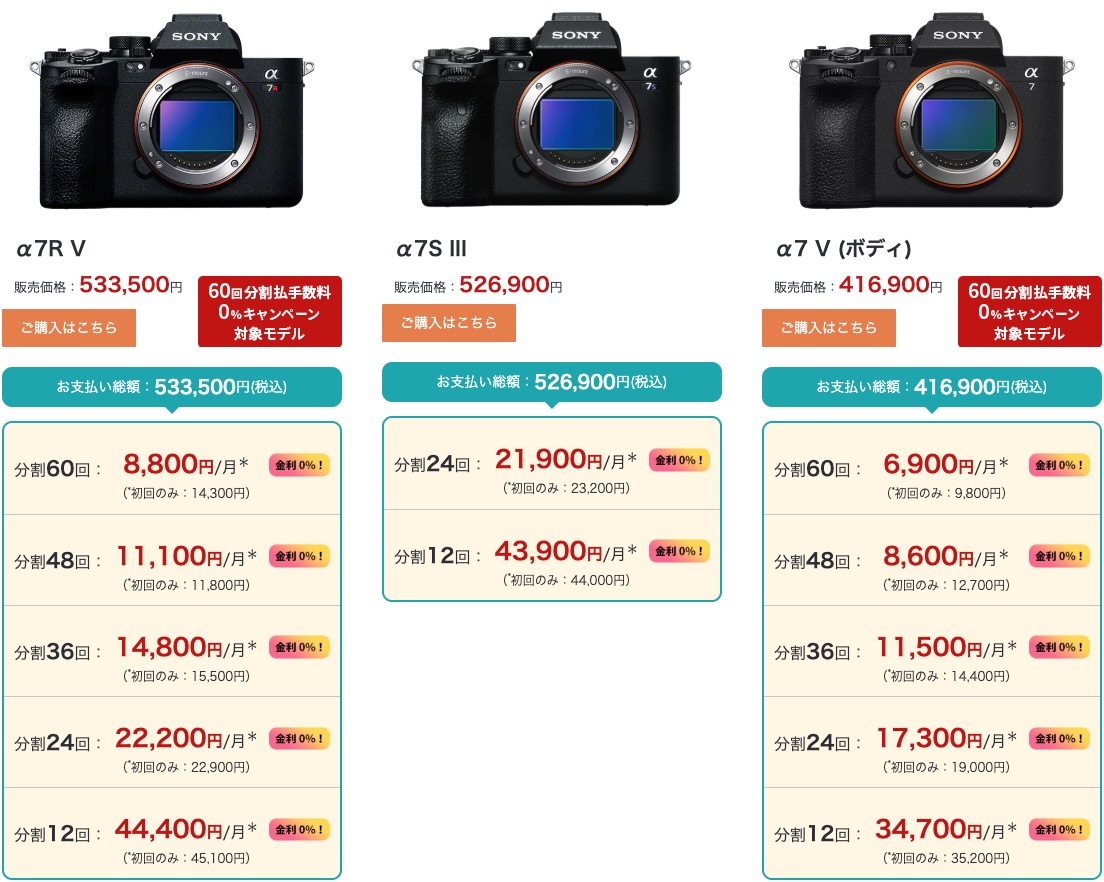 今回販売を開始したデジタル一眼カメラα7 Vが新たに分割払い60回まで金利手数料0%の対象となっている。