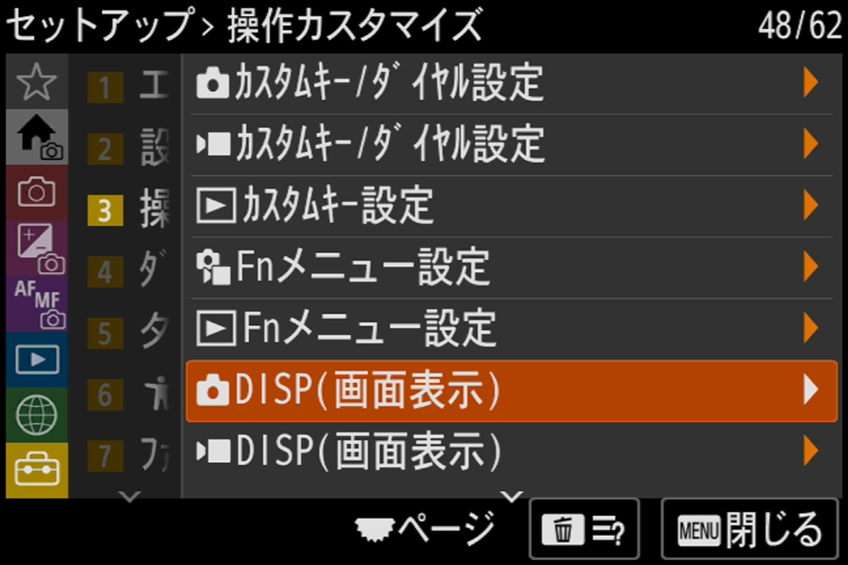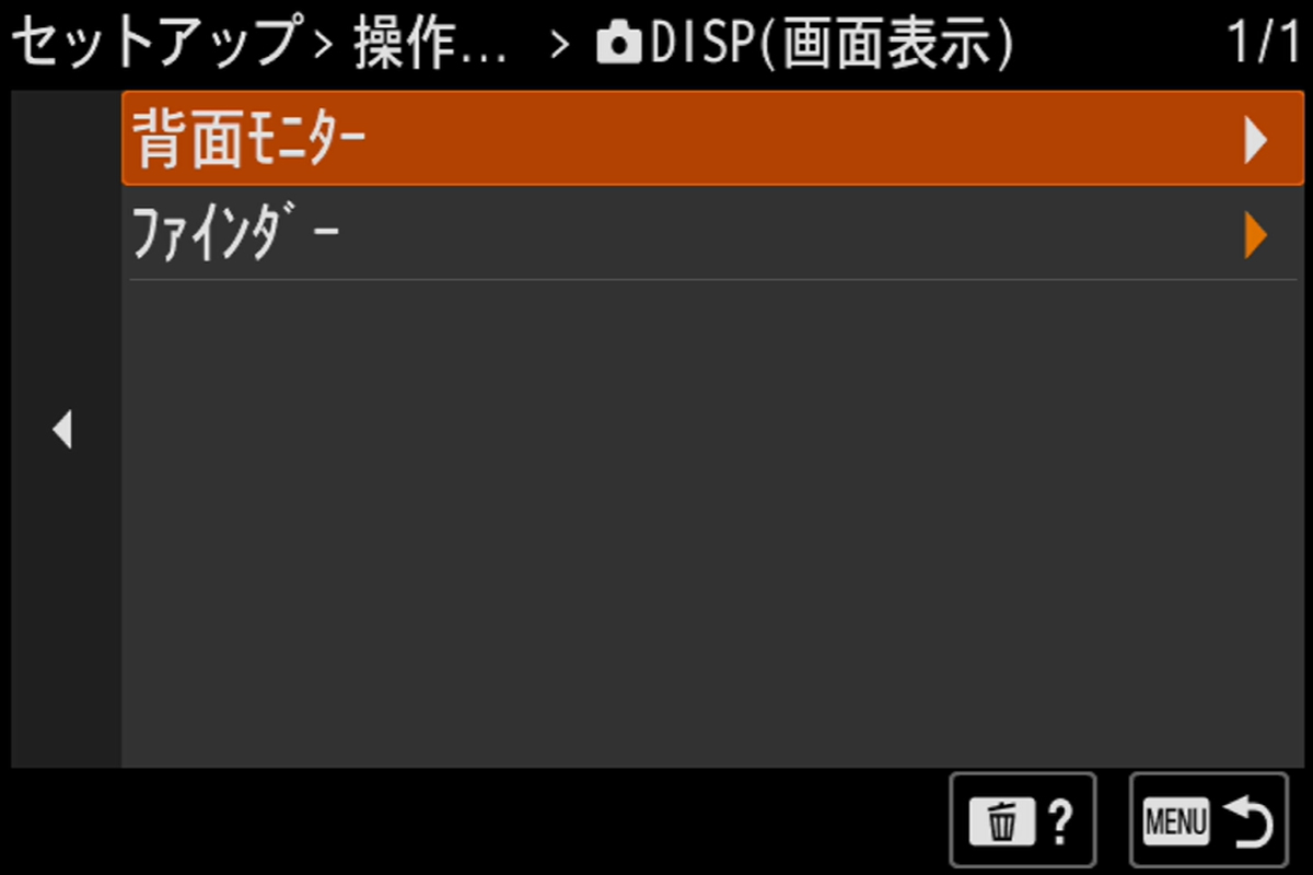 画面表示の設定場所は、MENU→(セットアップ)→[操作カスタマイズ]→[DISP(画面表示)]→[背面モニター]または[ファインダー]から。