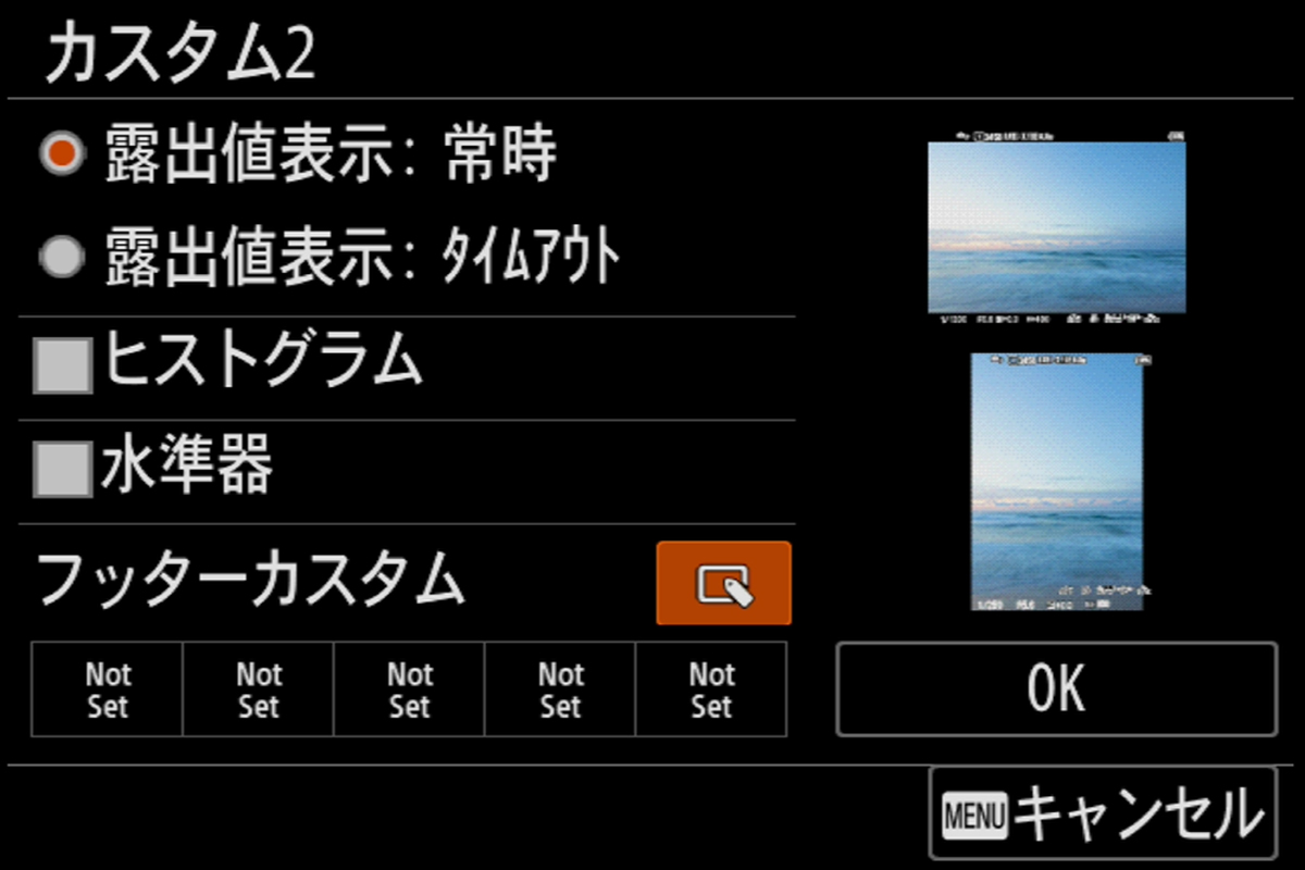 カスタム画面(フッターカスタム)」は画像のように、上の段から項目(撮影情報)を選び、下の段の最大5つ枠にカスタマイズできる。