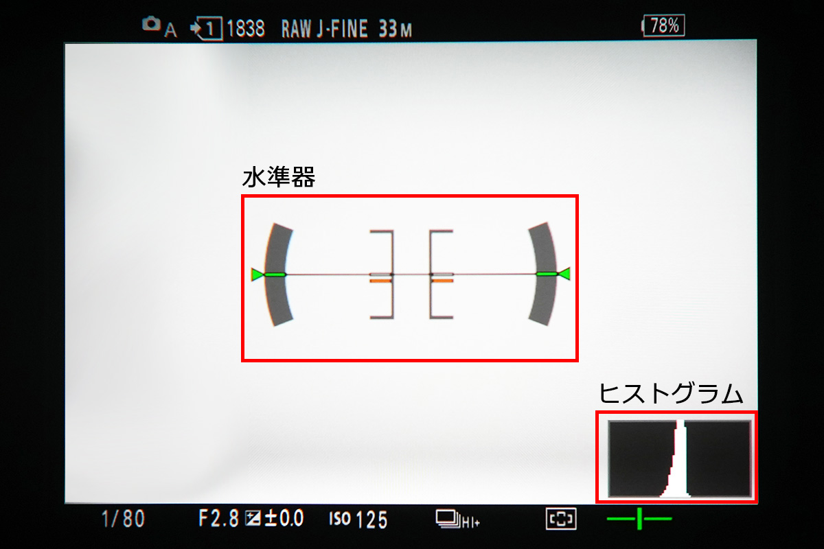 画面の中央に露出値の「ヒストグラム」と、右下に「水準器」を同時表示できるようになっている。