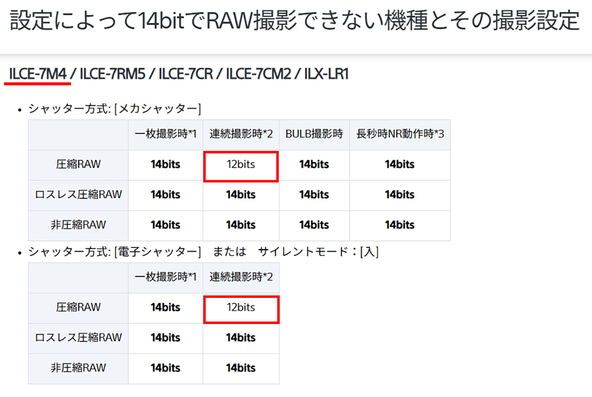 例えばα7IVでは、上図のように「圧縮RAW」の連続撮影時(連写時)は12bitに制限されている。