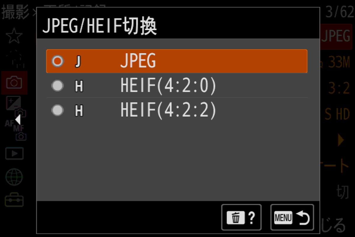 α7 Vの撮影設定として、「JPEG」の他に、「HEIF(4:2:0)」、「HEIF(4:2:2)」が選べる。