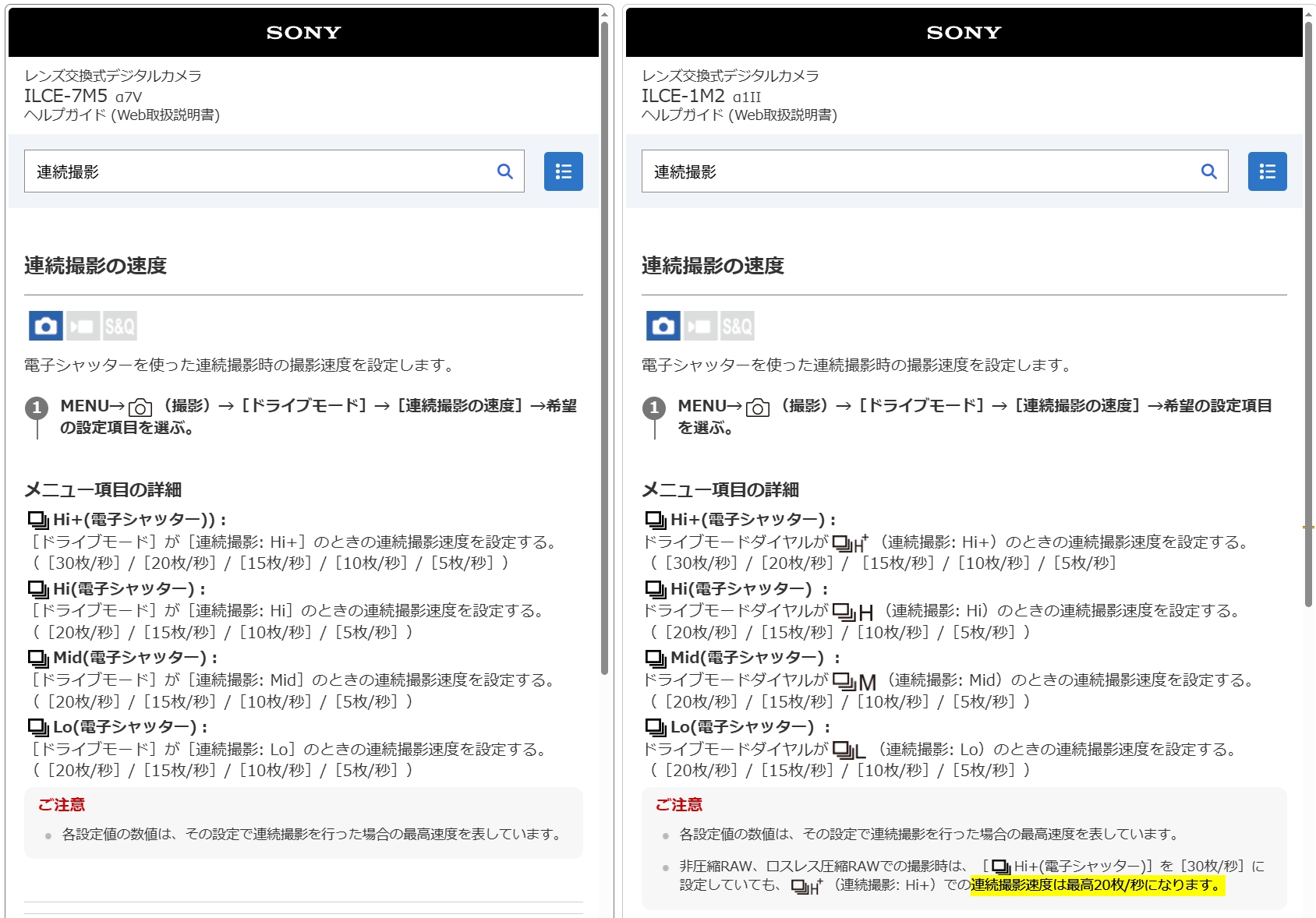 例えば、α1 IIは、「非圧縮RAW」・「ロスレス圧縮RAW」では連続撮影速度が最高20枚/秒に制限される。
