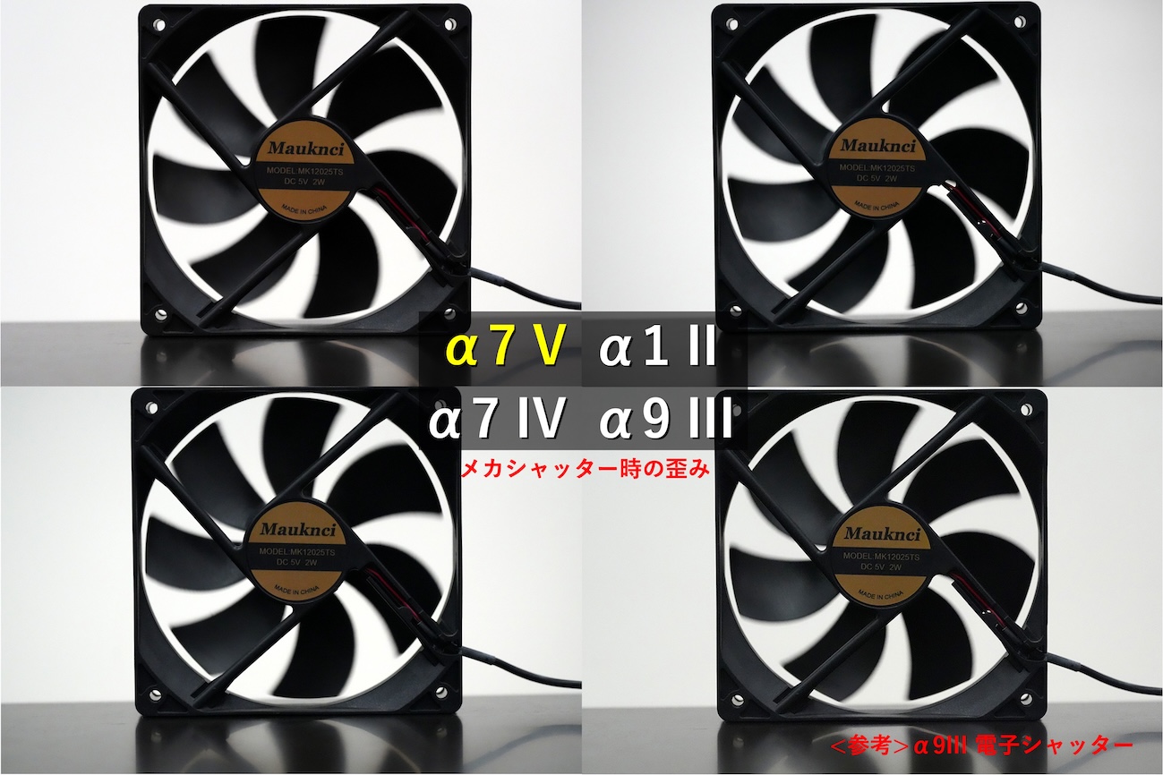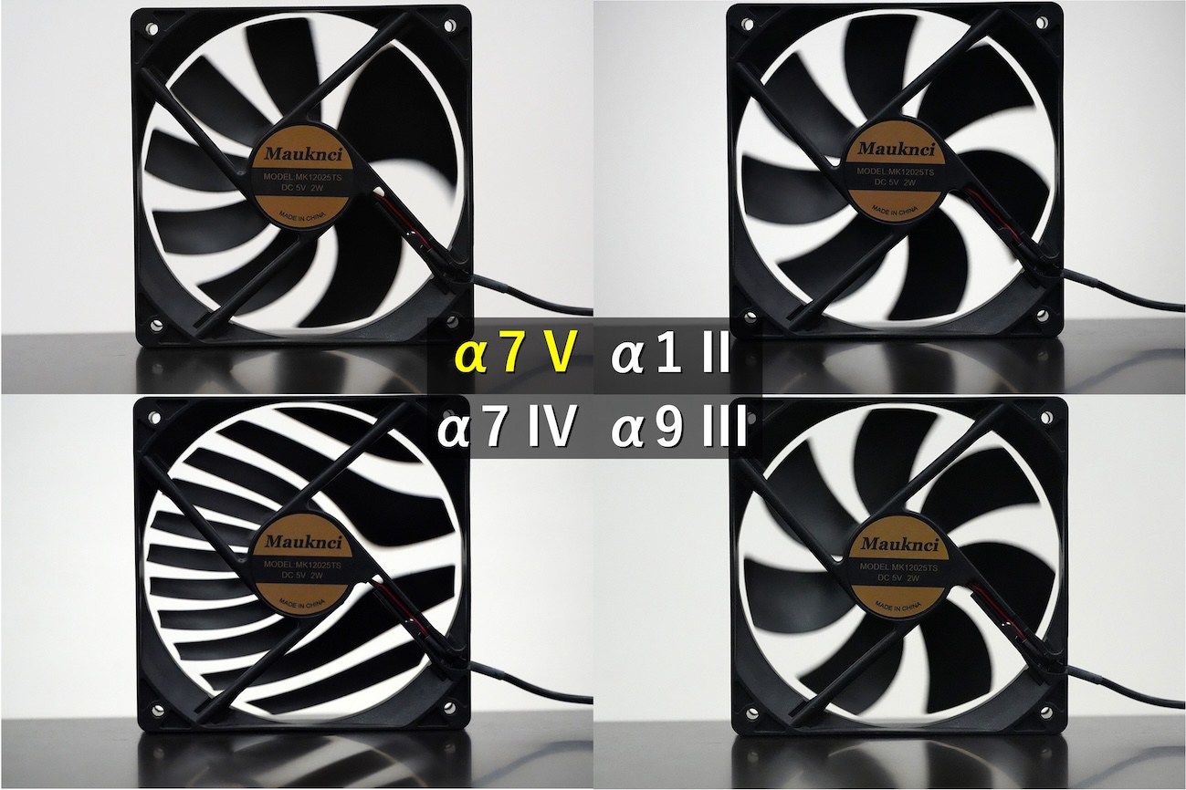 α7 V、α7 IV、α1 II、α9 IIIそれぞれの電子シャッターで撮影したファンの画像を並べてみたもの。