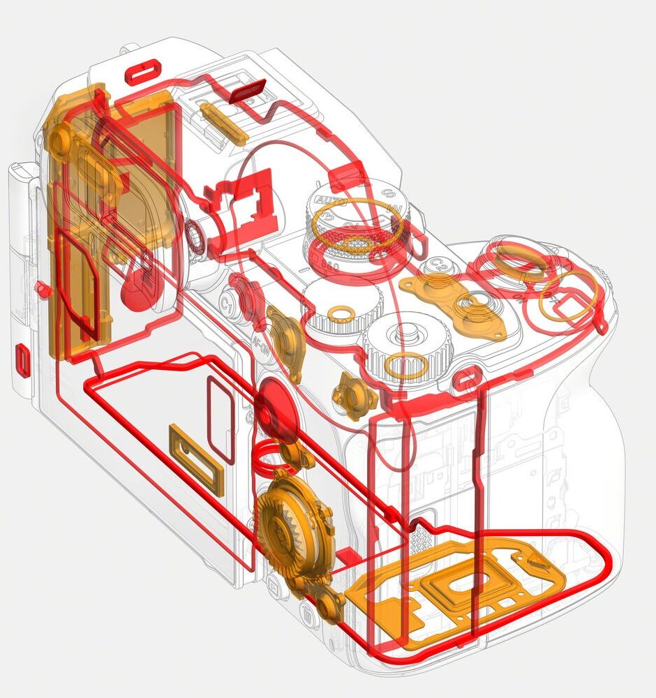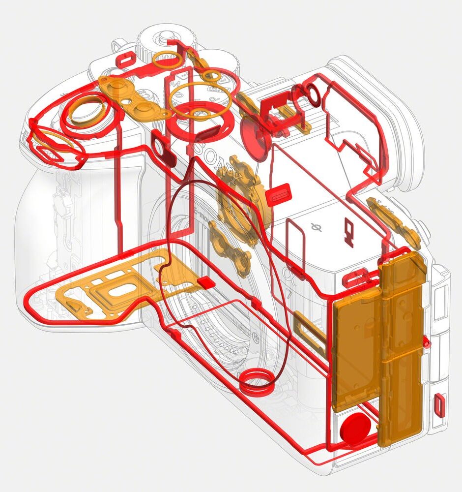 ボタン周りのシリコンゴムパッキン、レンズロックボタン、マウント周りのクッション、ゴミや水滴の浸入経路となりえる箇所の構造の工夫により、屋外の厳しい撮影環境での使用にも耐えられるように、防塵・防滴に配慮した設計となっている。