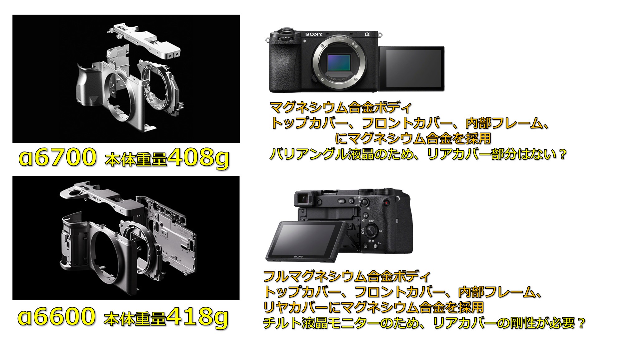 α6700「ILCE-6700」は、チルト液晶モニターではなバリアングル液晶になったこともあって、背面側の剛性は十分フォローできるものだという事かもしれない。