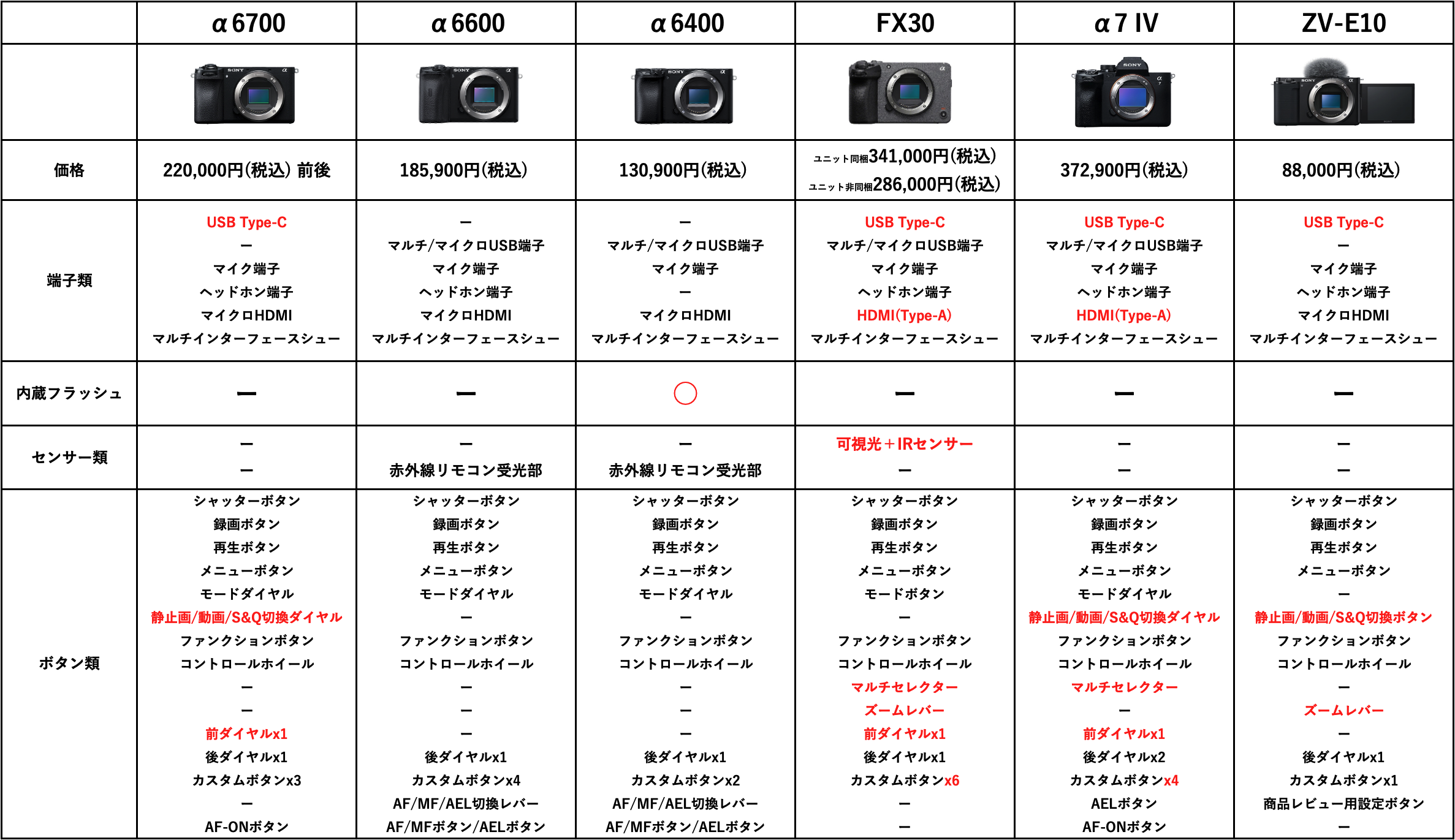 価格を比較すると、「FX30」が273,900円(税込)~、α6700は、(税込)。