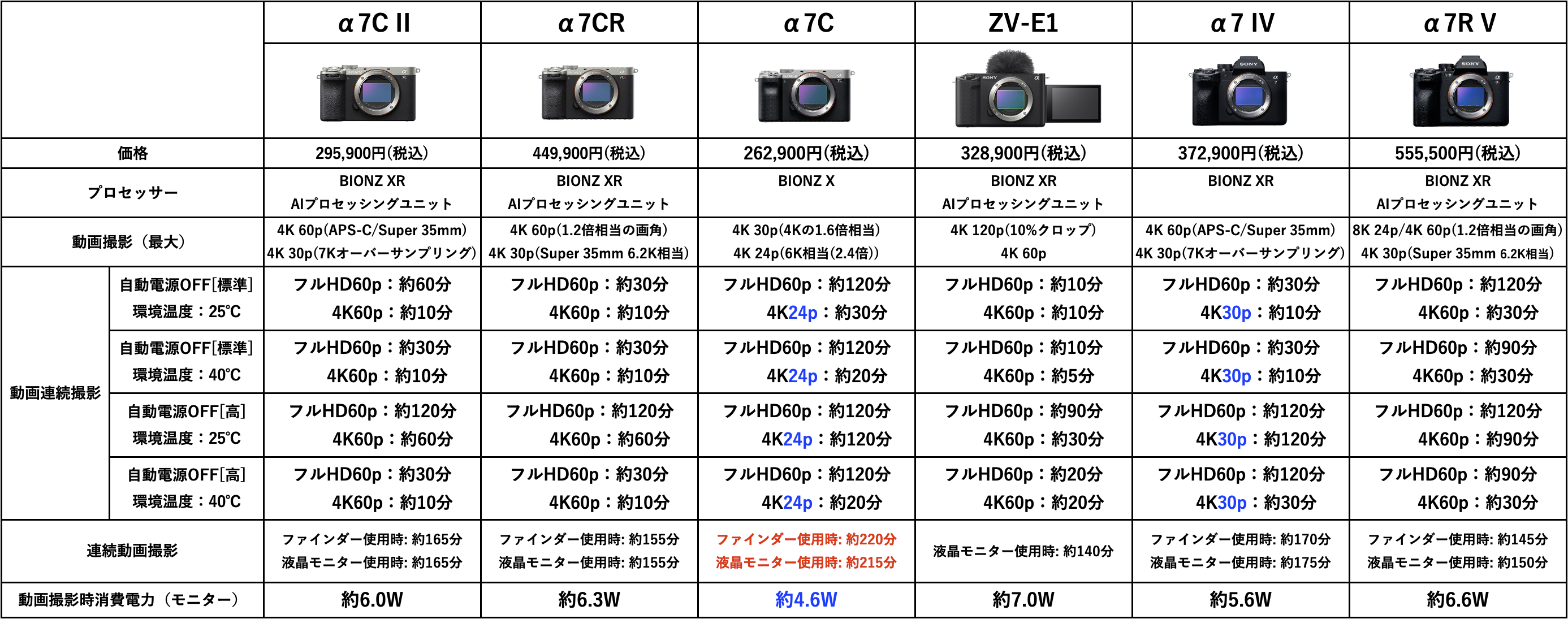 そこで今回は、α7CRとその他ハイエンドαを、ソニー公式ページからのデータをもとに比較して、熱に対する強さを調べてみる。