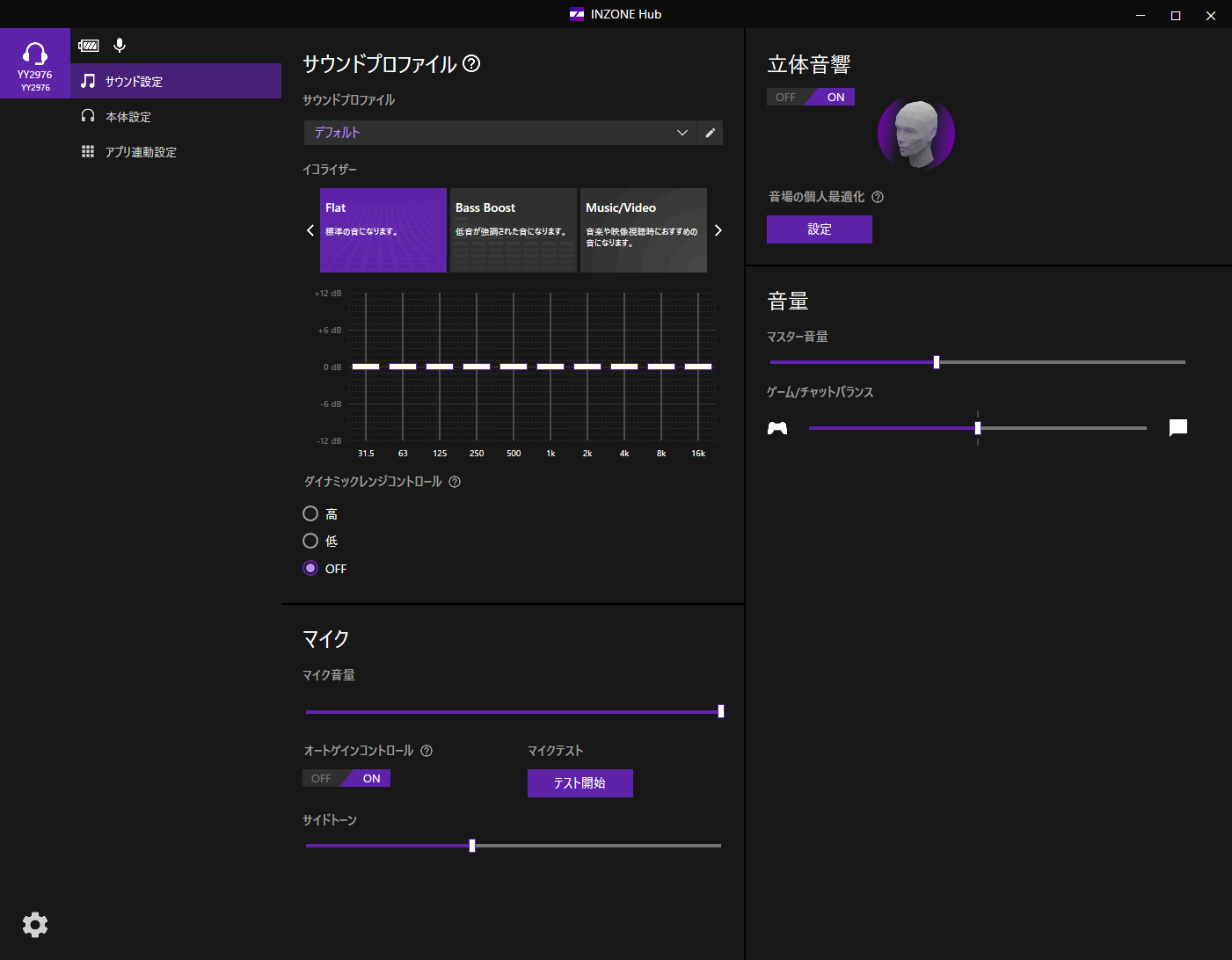 ヘッドセットのイコライザー設定、ダイナミックレンジコントロール、マイクの調整・テスト、立体音響設定、個人最適化などが利用できる。
