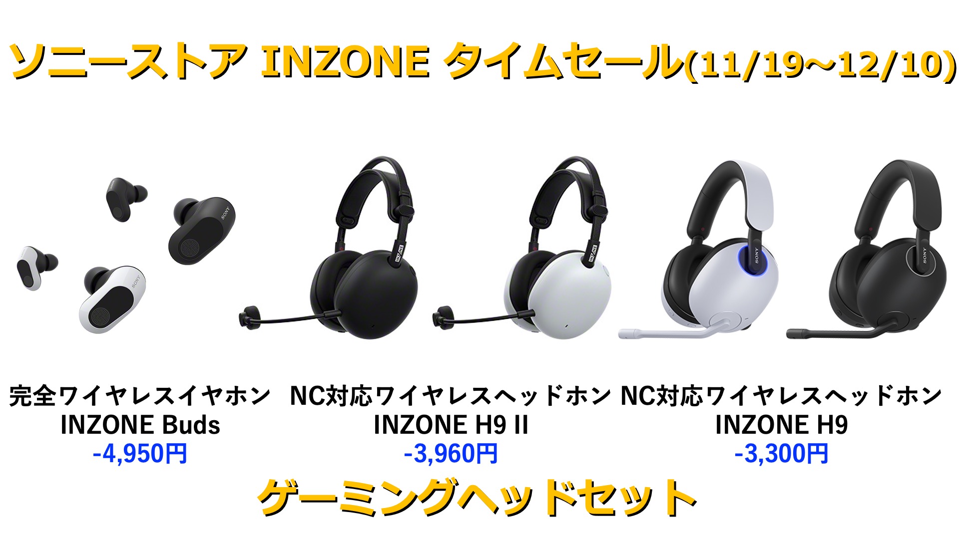 ゲーミングヘッドセット「INZONE Buds / INZONE H9 II」など、ソニーストア タイムセールを12月10日まで開催。最大約5千円の大幅値下げ。