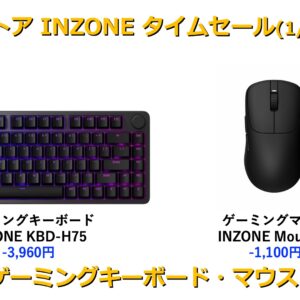 今回は、ゲーミングモニター、ゲーミングヘッドセット、ゲーミングキーボード・マウスなど多くの製品が対象となっており、新製品のキーボードINZONE KBD-H75、INZONE Mouse-Aもより安く手に入る。