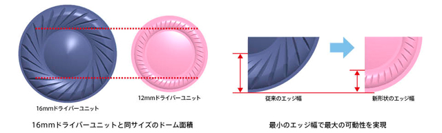 16mmドライバーユニットと同じサイズの360kJ/m3高磁力ネオジウムマグネットと、従来のボイスコイルよりも長く、マグネットとの接地を安定させるロングボイスコイルを採用した新開発の12mmドライバーユニットを搭載。