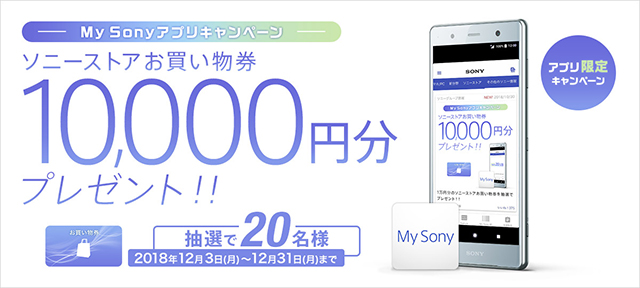 My Sony 特典、2018年12月の「ソニーストアお買い物券10,000円プレゼント-My Sonyアプリキャンペーン-」。My Sonyアプリから応募しよう。