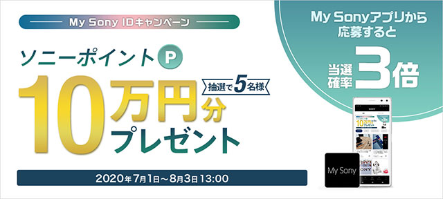 10万円分のソニーポイントが当たる、2020年7月のMy Sony IDキャンペーン 。My Sony アプリから応募すると当選確率が3倍。