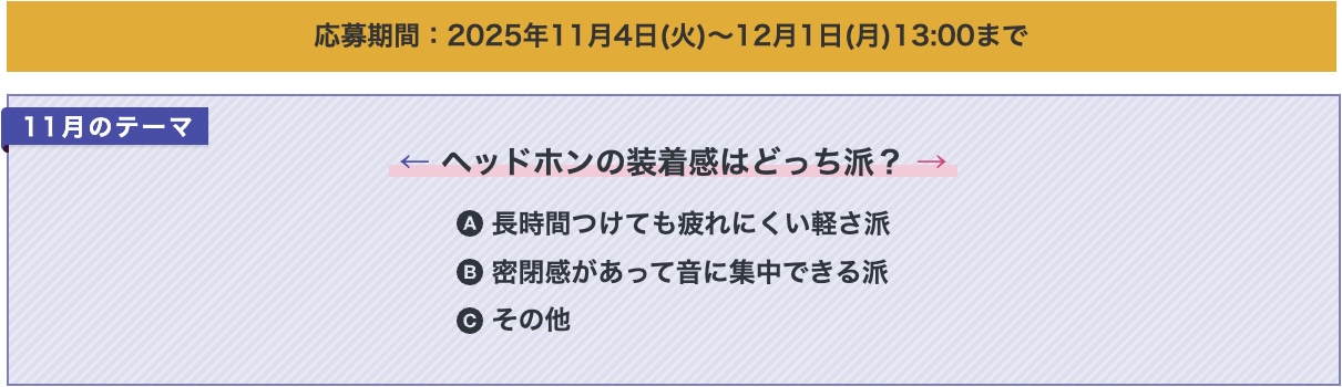 11月のテーマは、ヘッドホンの装着感の好みについて、長時間つけても疲れにくい軽さ派か、密閉感があって音に集中できる派か。