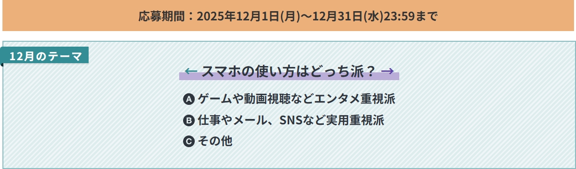 12月のテーマは、スマートフォンの使い方について、ームや動画視聴などエンタメ重視派か、仕事やメールSNSなど実用重視派か。