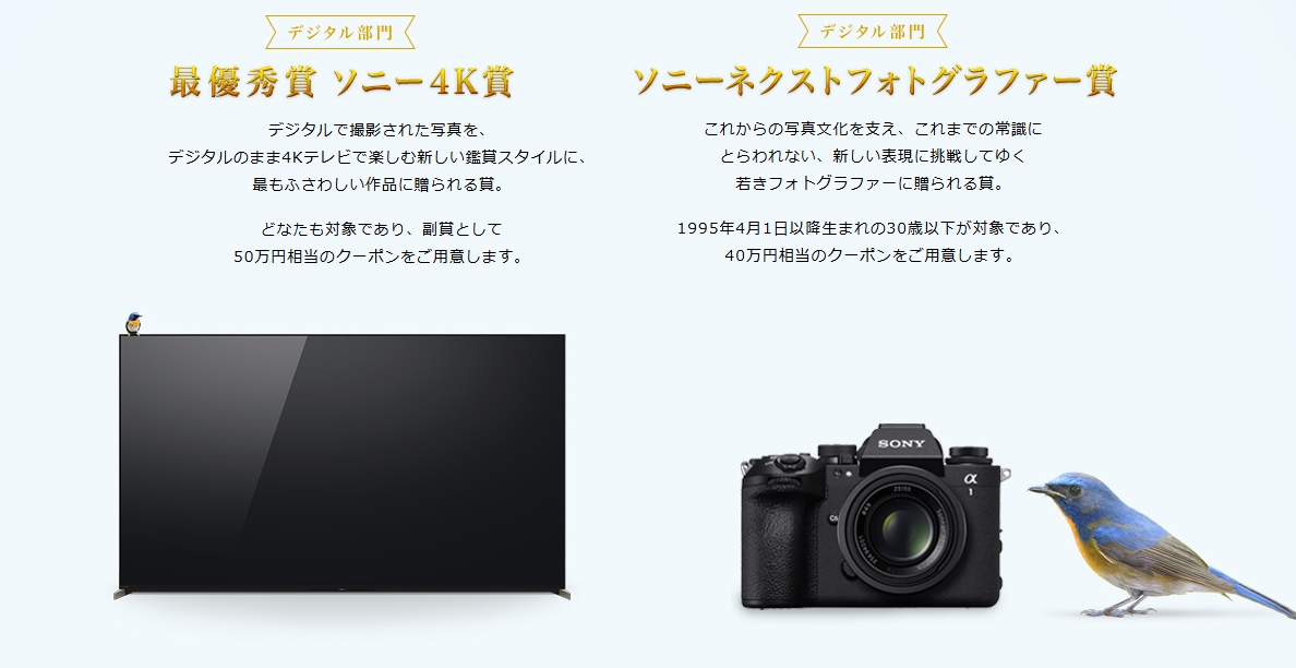 ソニーが協賛するこのフォトコンテストは、「プリント部門」、「デジタル部門」というわかりやすい2部門で、得意な分野に応募できるのがポイント。