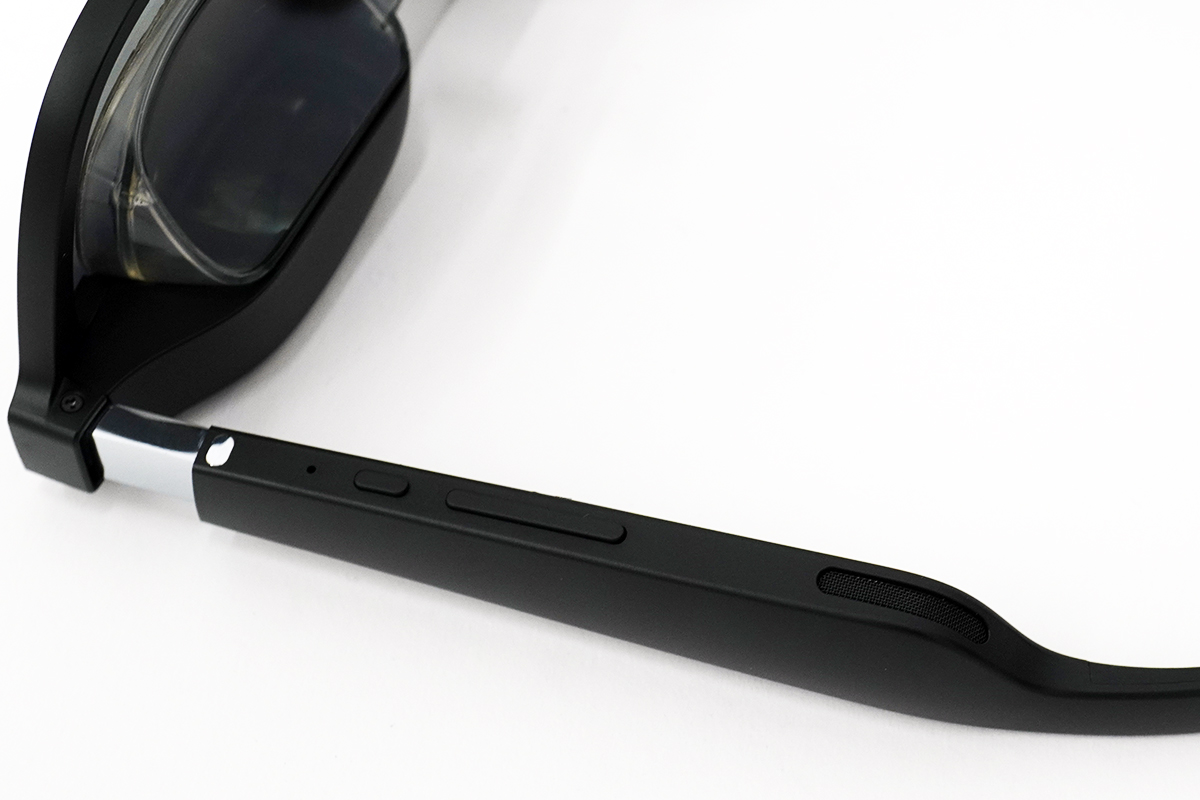 右テンプルには、他にマイクと、ディスプレイのオン/オフボタン、輝度調整ボタンも備わっている。