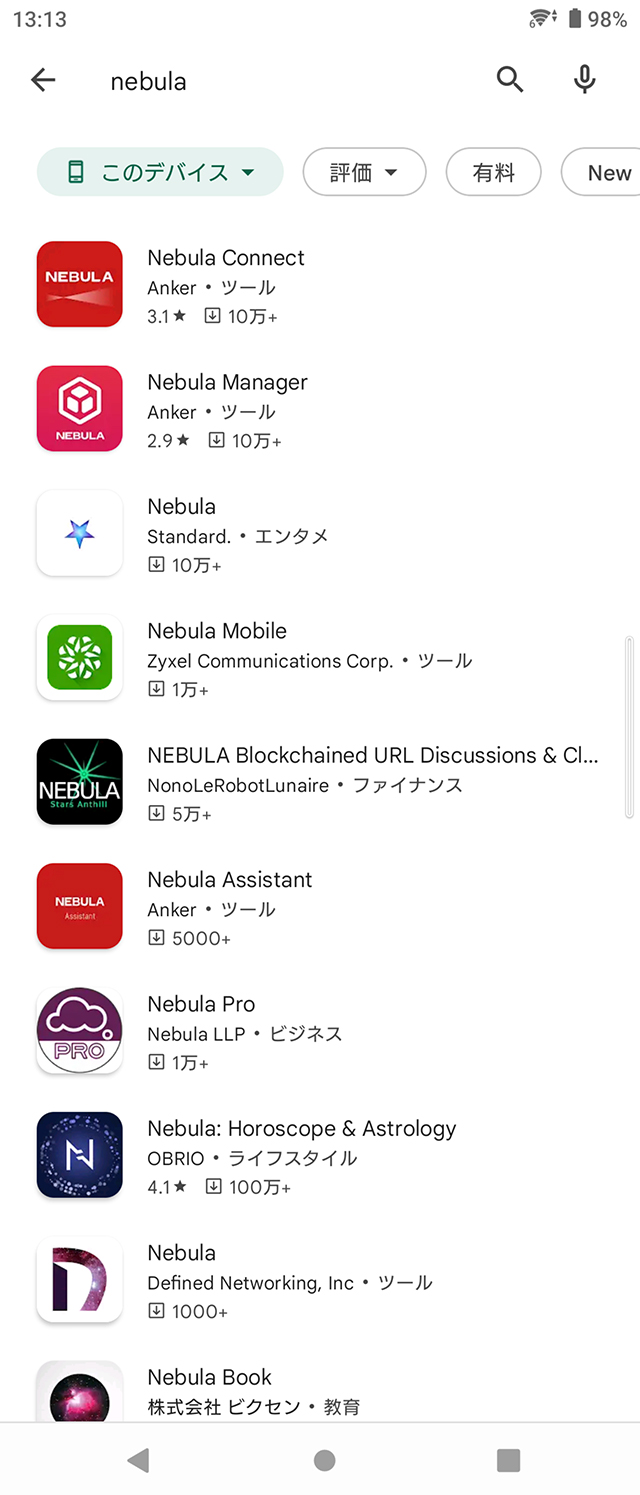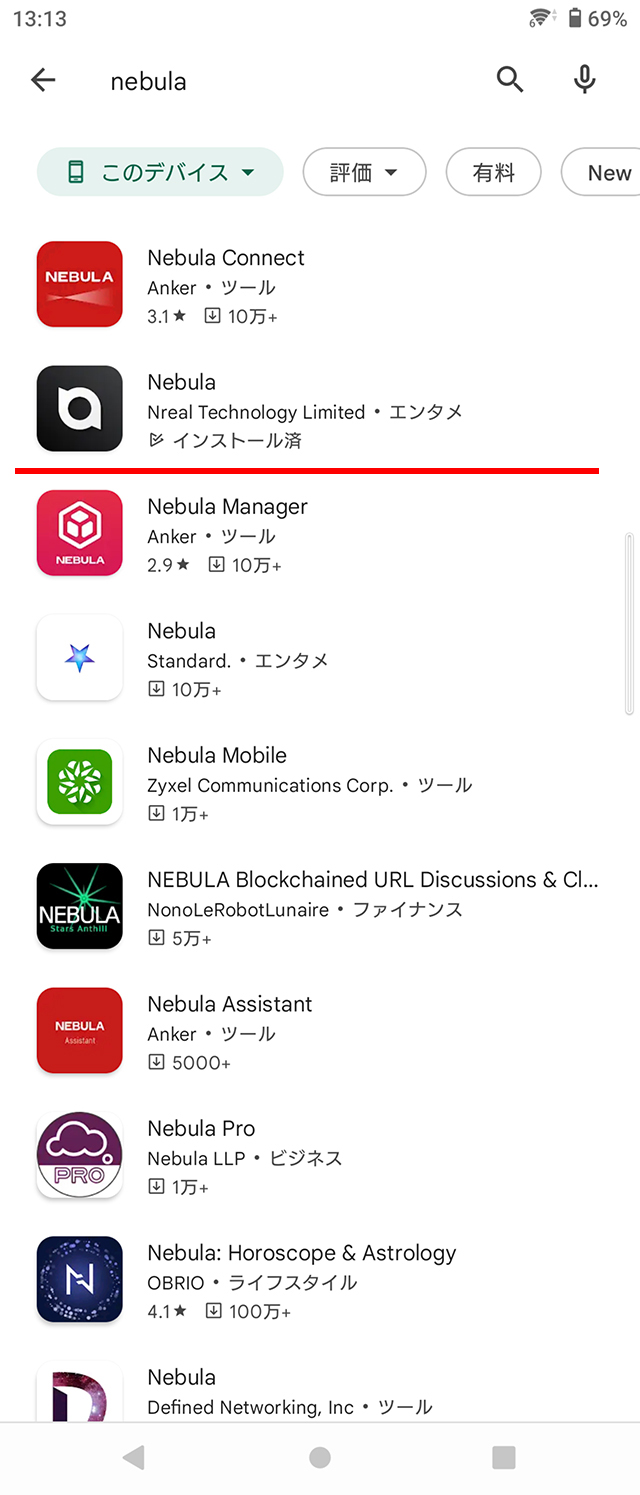 いやいやまさかいけるでしょーと思って、Xperia 1 III で試したところ、Google PLAY に「Nebula」アプリが表示されない。