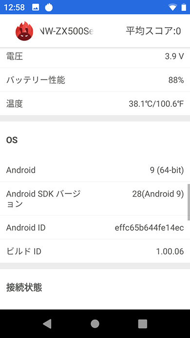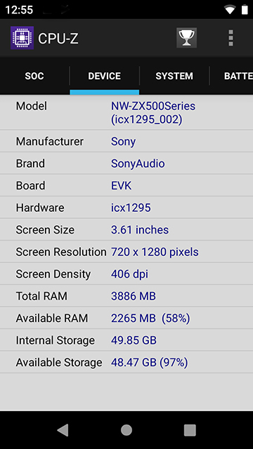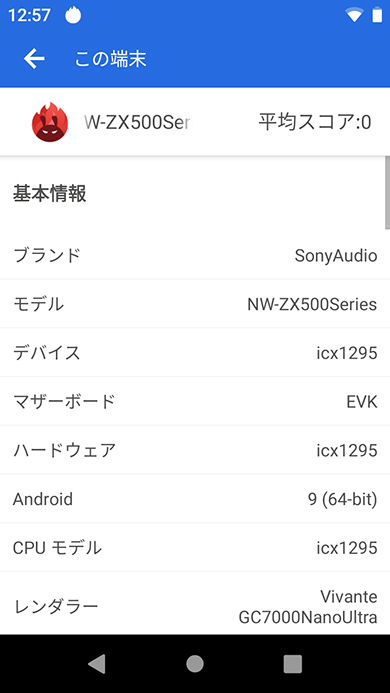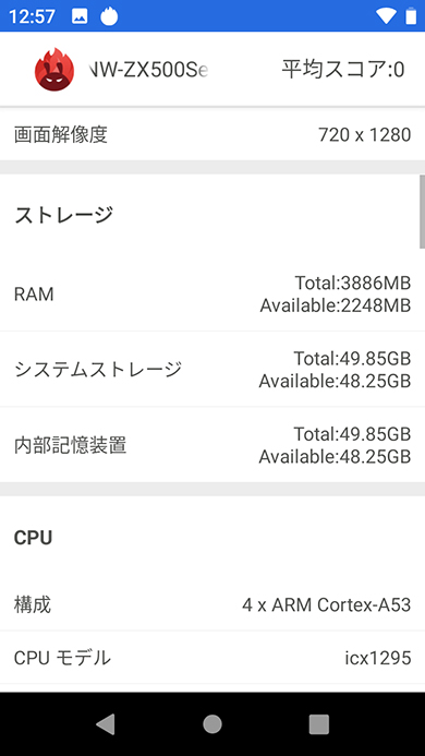 「NW-ZX500シリーズ」のSocは「ARM Coerwx-A53 1.80 Ghz」、RAM(メモリー)は、3886MB(約4GB)。