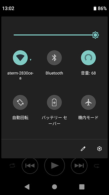 画面上部から下にスワイプするクイック設定には、デフォルトとしてWi-Fi、Bluetooth、音量、自動回転、バッテリーセーバー、機内モードの6つが並ぶ。