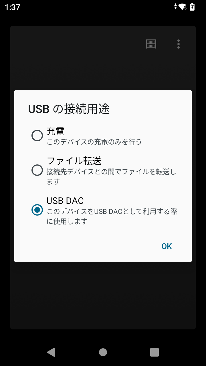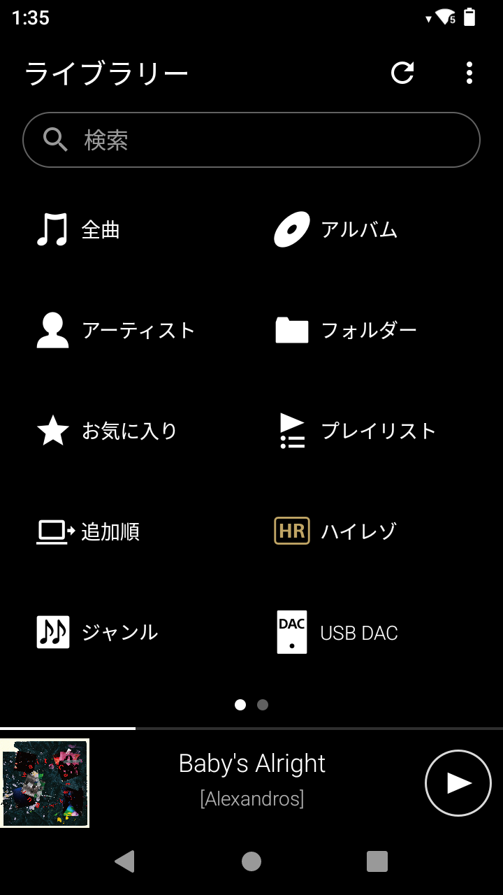 USB-DAC機能に切り替えるには、「ミュージックプレーヤー」のライブラリ画面で、[USBDAC]をタップするだけ。