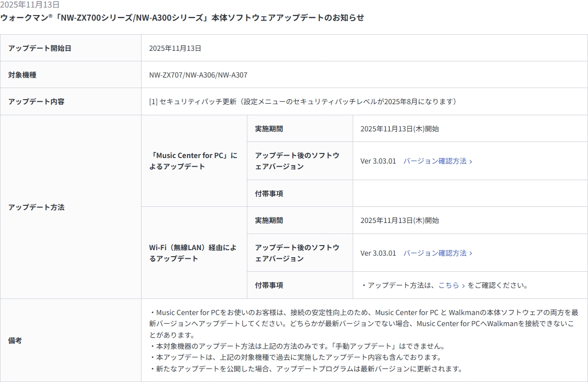 ウォークマン「NW-ZX707」「NW-A300シリーズ」に、本体ソフトウェアアップデート2025年11月13日配信(Ver. 3.03.01)。
