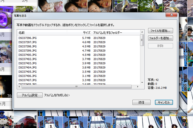 ファイル/フォルダから追加するもよし、ドラッグ&ドロップで「写真を送る」ウィンドウ内に突っ込んでもよし。