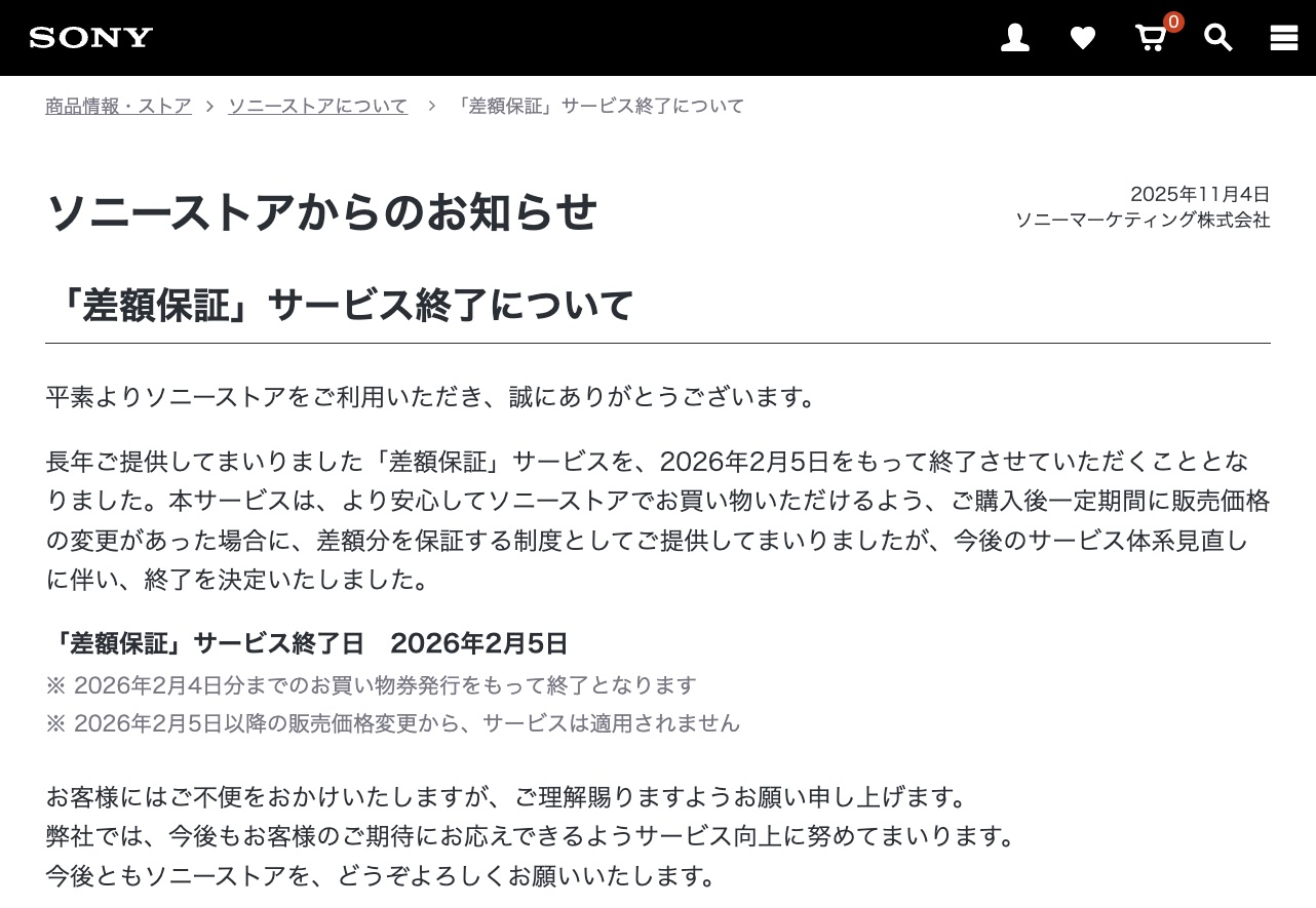 ソニーストア、販売価格を値下げした時の「差額保証」サービスを 2026年2月5日をもって終了。