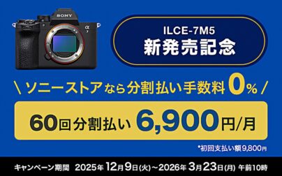 α7V「ILCE-7M5」発売記念「分割払い60回まで金利手数料0%キャンペーン」ソニーストアで開催!2026年3月23日(月)午前10時まで。