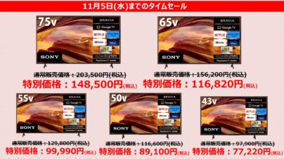 SONY 4K液晶テレビ ブラビア BRAVIA X75WLシリーズ全モデル【75~43型】、ソニーストアのタイムセールで最大38,500円大幅値下げ!クーポンやお買い物券併用で55型までは10万円以下で購入も可能。2025年11月5日(水)まで。